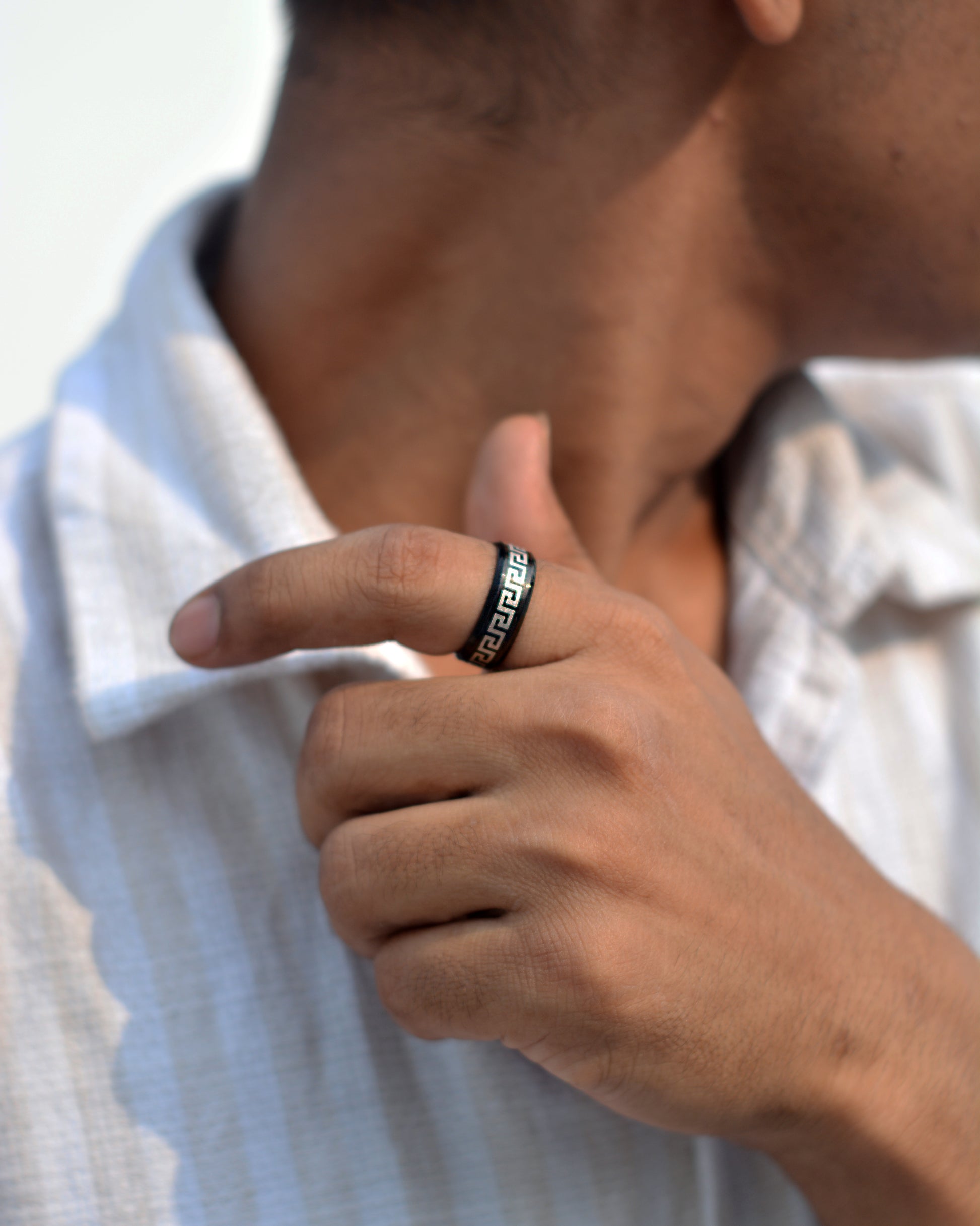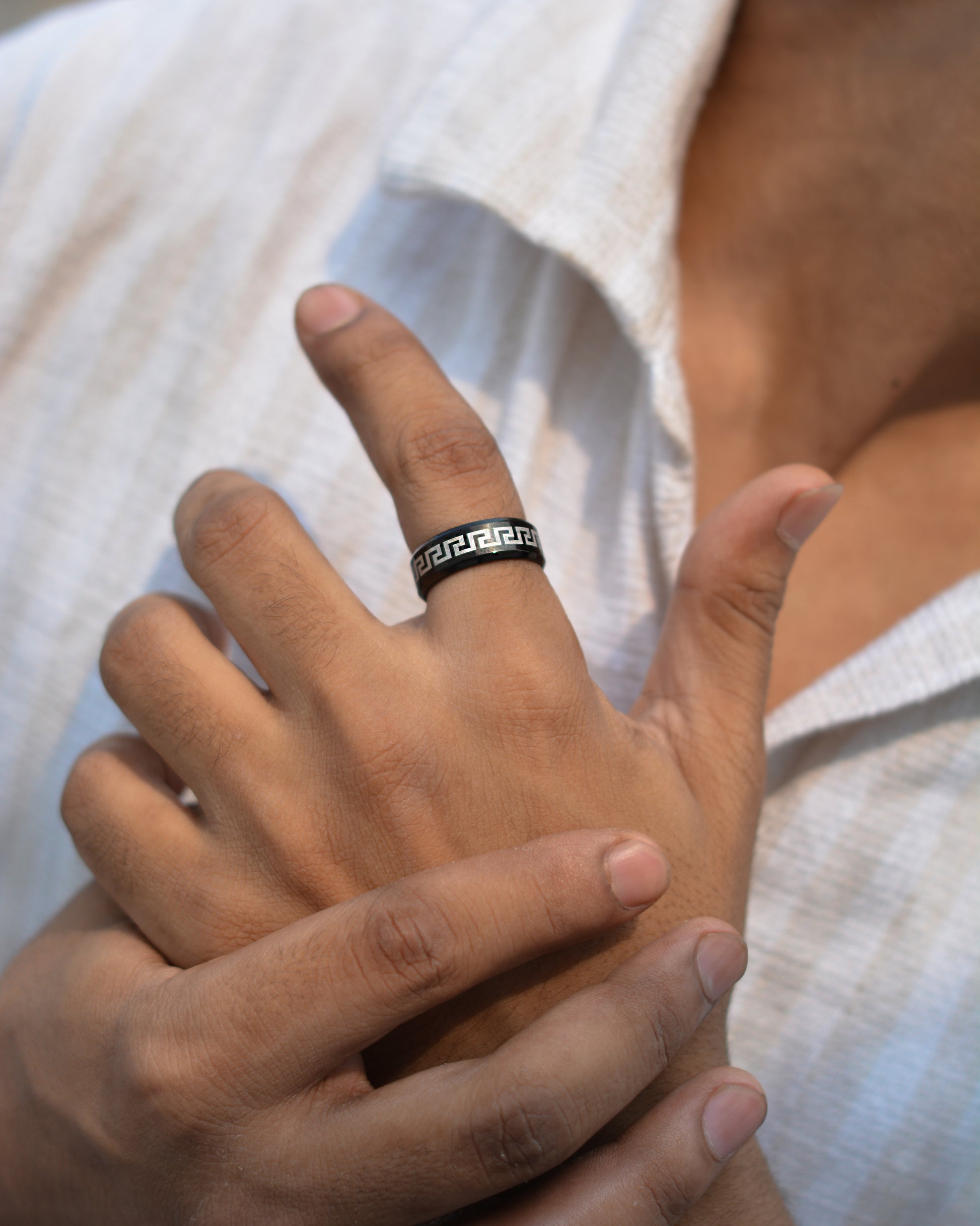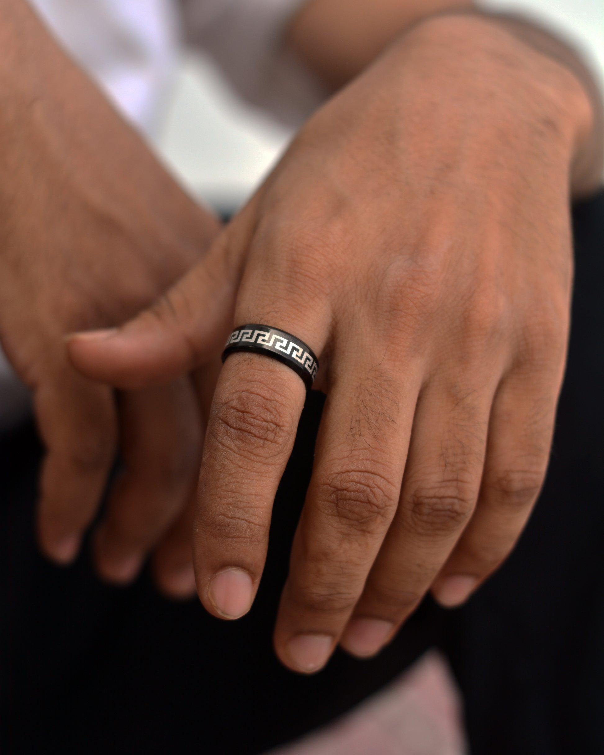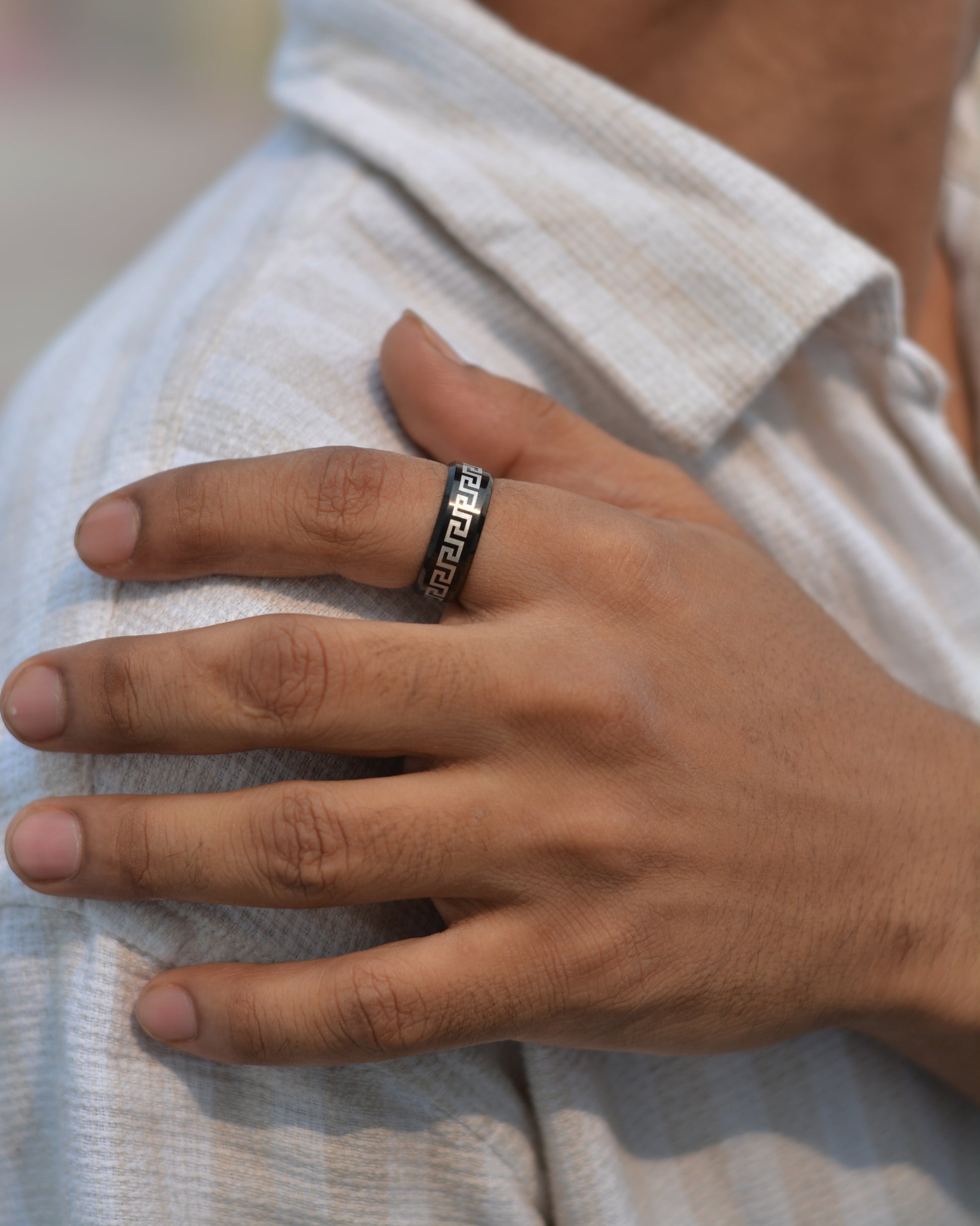 This is Black Greek Key Ring-Featuring a sleek black base adorned with a striking silver Greek key pattern, this ring symbolizes unity and infinity. Perfect for those who love bold, timeless designs that make a statement.