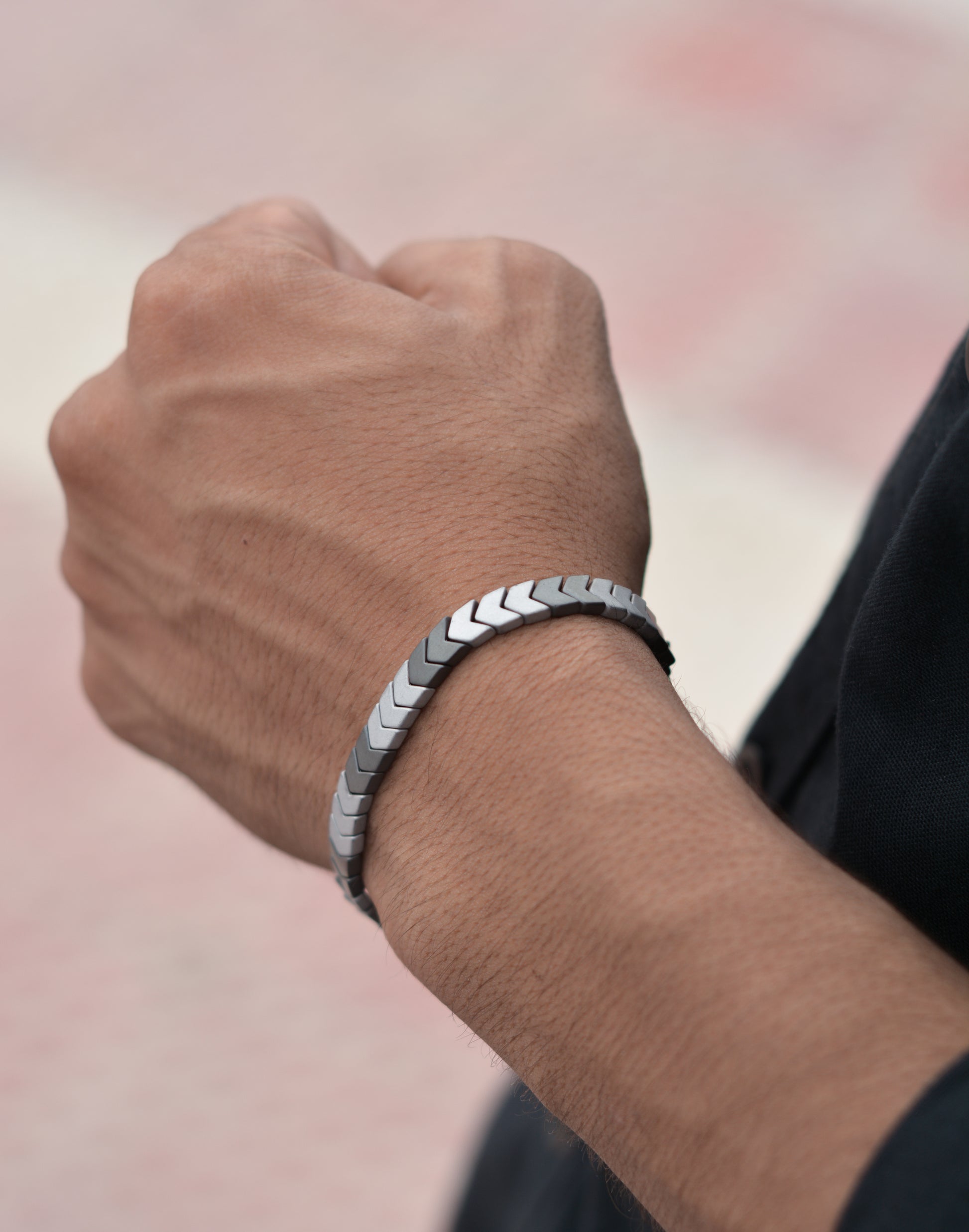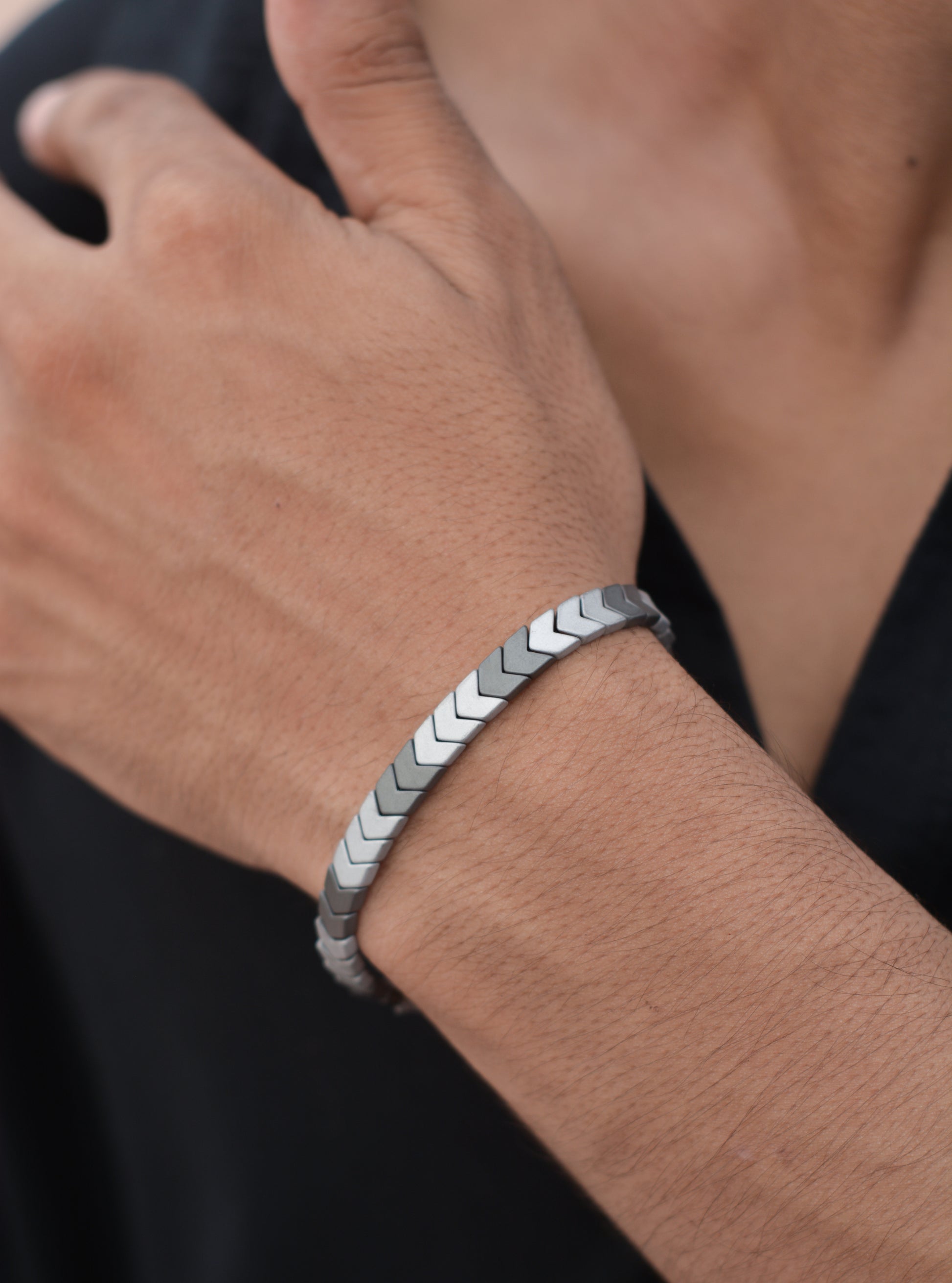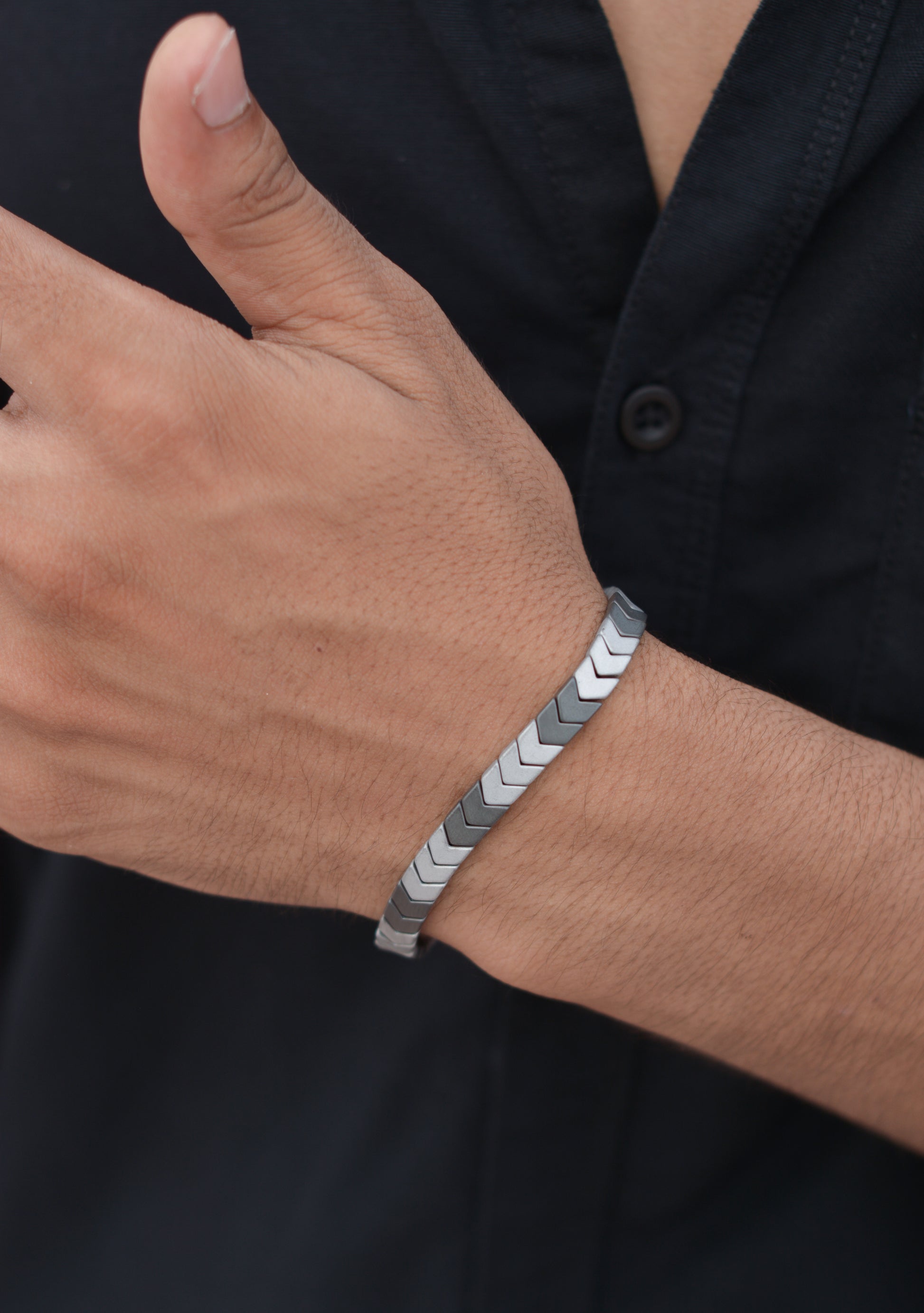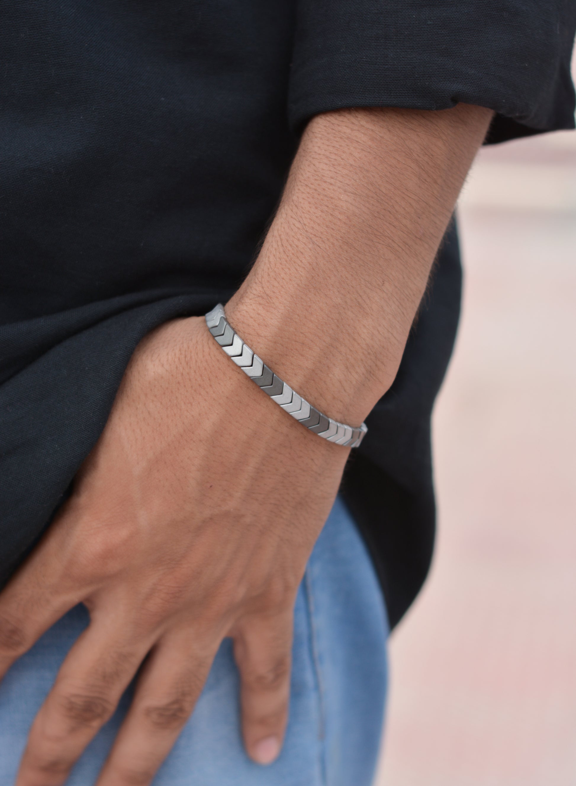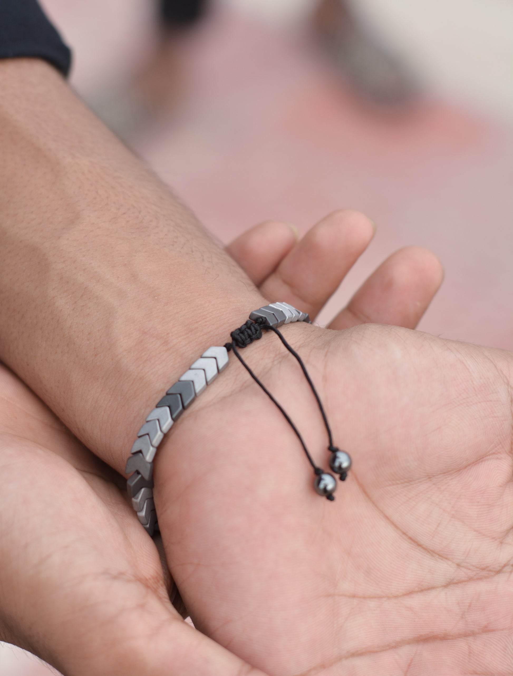 Introducing the Chevron Charm Bracelet – where elegance meets modernity. This stunning piece features an intricate series of silver chevron patterns, seamlessly connected on a sleek black adjustable cord for the perfect fit. Its unique design and reflective surface catch the light beautifully, making it not just a bracelet but a statement. It has rusty design.
