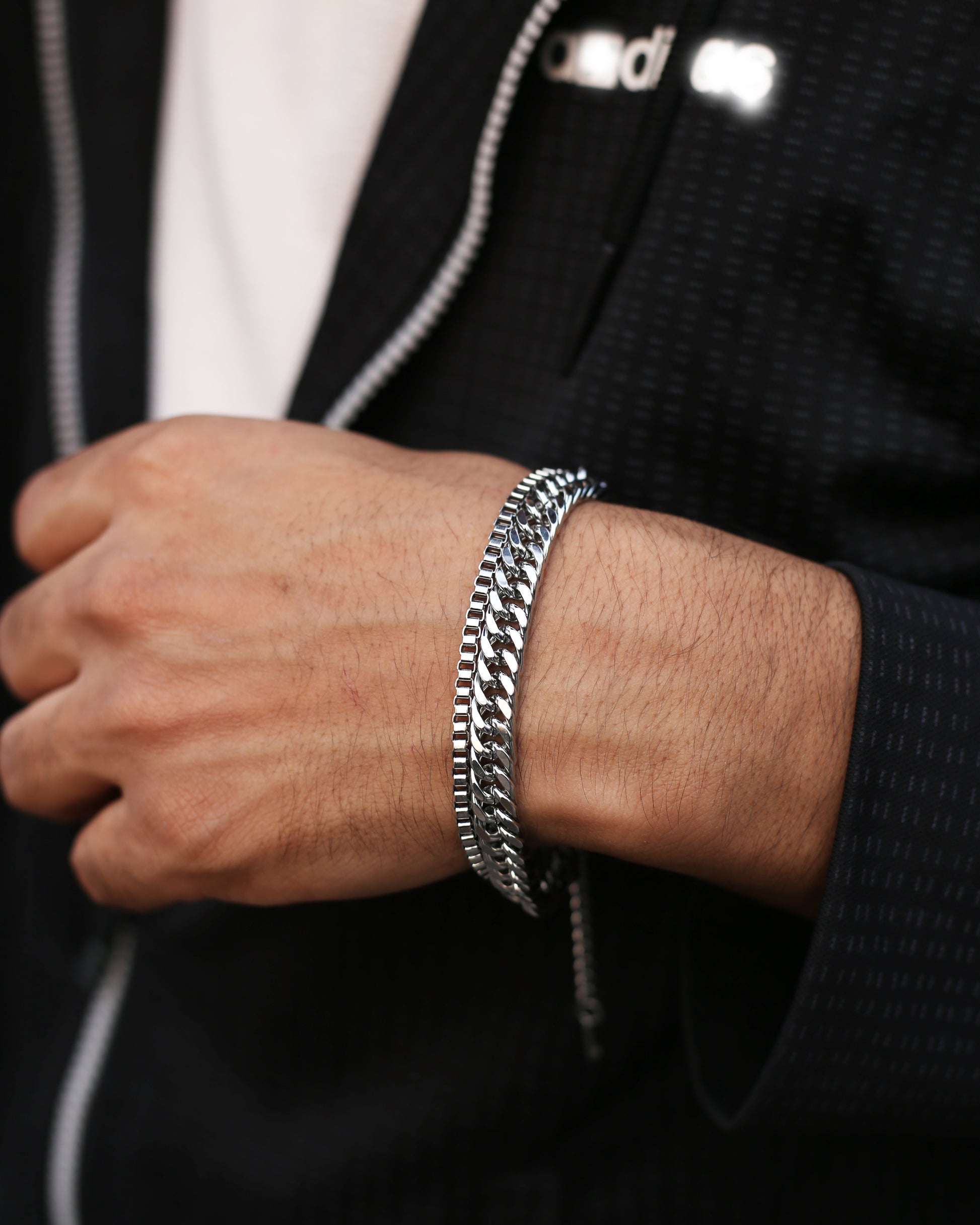 This is Cubox Bracelet . It is double layer bracelet mix of Cuban and Box chain. Statement chain. Subtle flex. Designed to elevate your everyday fit.