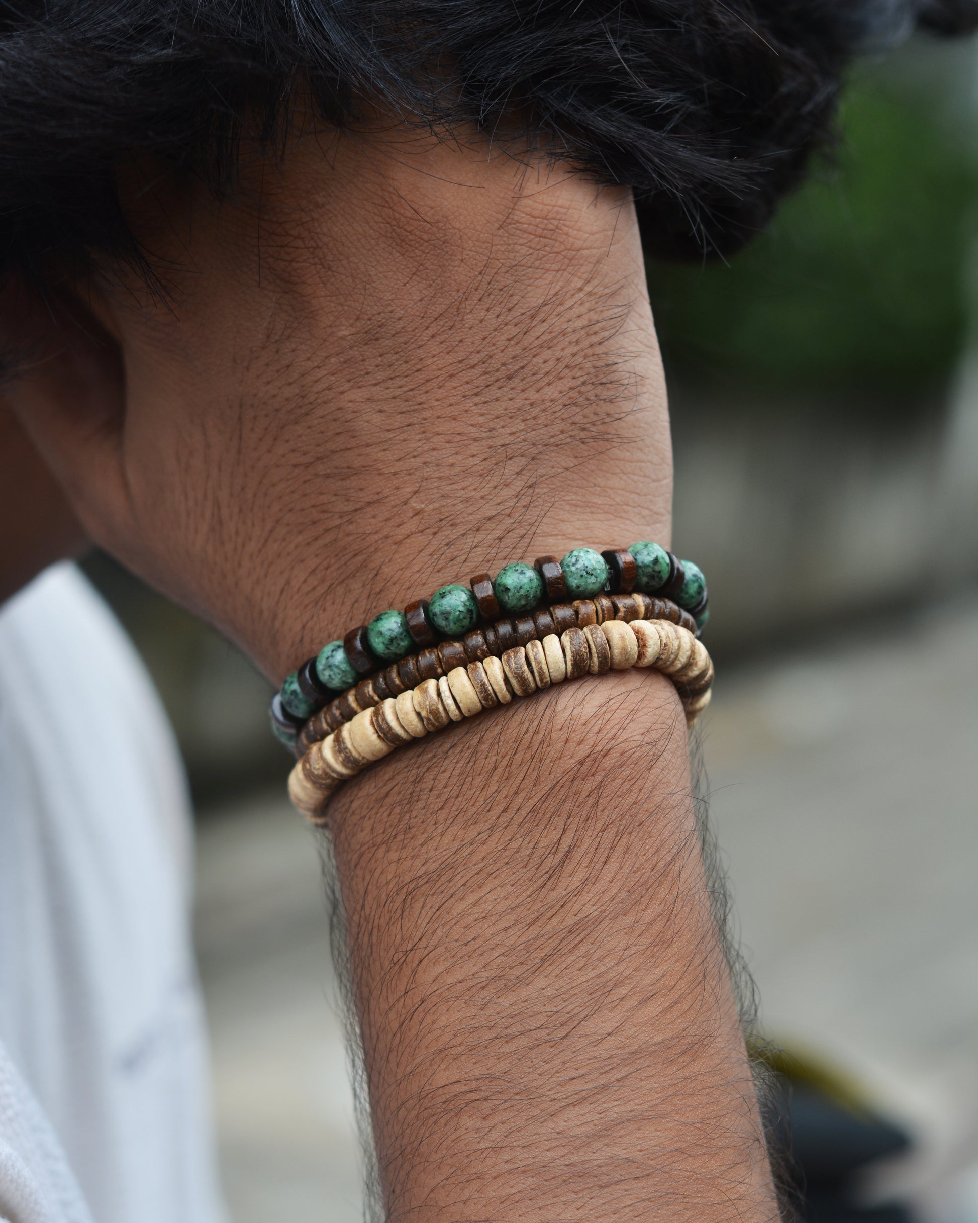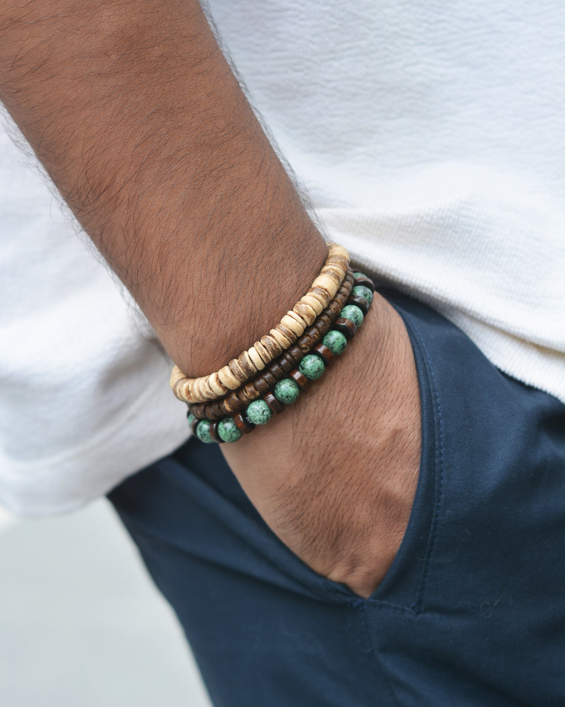 This is Earthy Elegance Bracelet. It features a combination of natural stone beads in shades of green, complemented by wooden beads in warm, neutral tones. The contrast of the earthy, organic materials creates a visually appealing and versatile accessory that can be worn casually or dressed up.