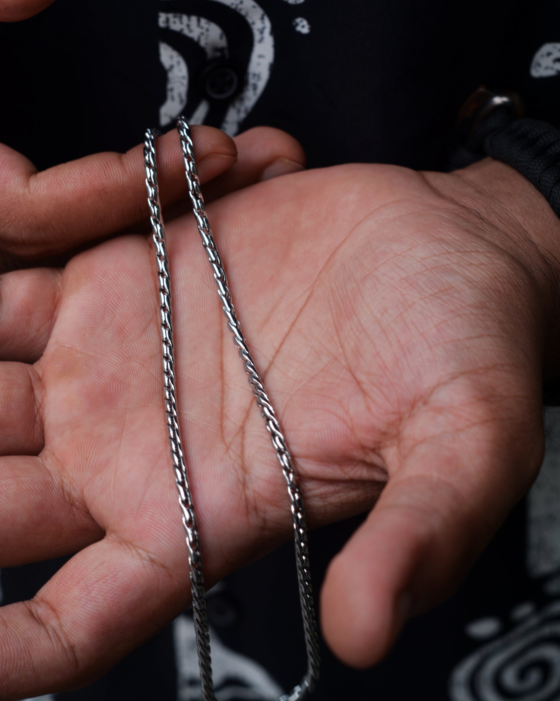 This is Halo Twist Chain. This twist chain exudes strength and elegance. A versatile staple that speaks in shine and subtle texture—designed to elevate your everyday or layer with statement pieces.
