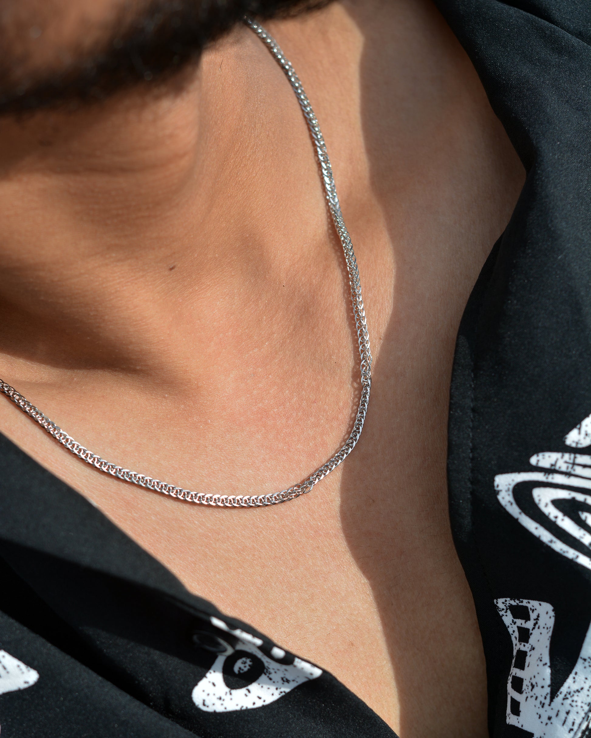 This is Phantom Weave Chain — a bold silver silhouette with fluid curves that command attention without saying a word. Built to complement both street edge and sharp tailoring, this piece brings stealth and shine in perfect harmony.